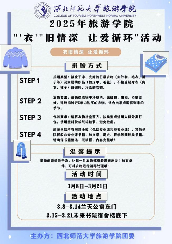 3月8日-3月21日,我院开展为期十四天的“‘衣’旧情深 让爱循环”旧衣、旧物回收活动,面向全校师生回收旧衣、旧物。3月8日-3月14日,回收点设置在兰天公寓沙排场东侧;3月15日-3月21日,回收点设置在未来书院东侧。