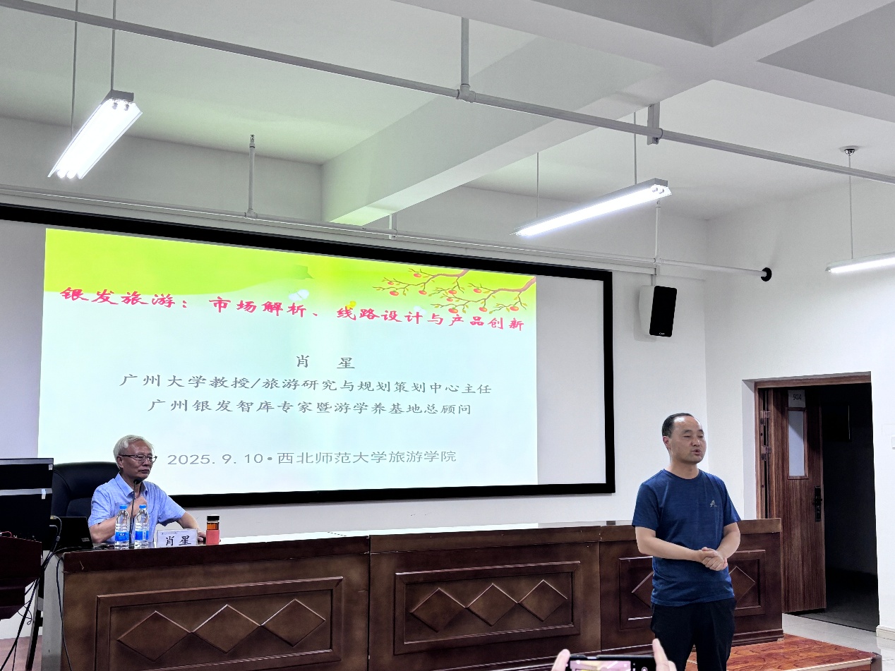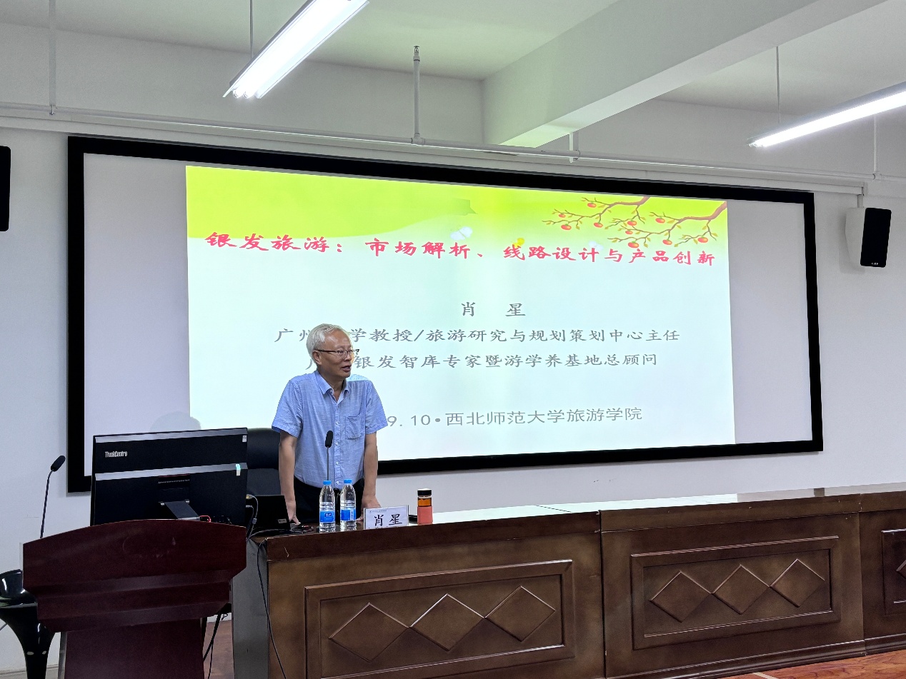肖星教授首先对自己教学科研成绩进行简要介绍,同时分享了自己的信念:几十年进取不息,笔耕不辍,活到老学到老写到老;一生努力践行、用心体验徐霞客名言——读万卷书,行万里路;余生不负总书记期望——老有所养,老有所乐,老有所为;出游谨记“四勤加持——眼勤、手勤、腿勤、嘴勤。接着肖星教授从银发旅游市场驱动力研判,提出了老年人群体有钱有闲有意愿,银发旅游需求旺盛;老年人数量剧增为我国银发旅游带来了庞大的消费群体;银发旅游健康发展的市场应对与适老化改造的“软硬件”协同。其需求特征表现为:注重健康与安全、偏好慢旅行与深度体验、强调文化归属与社交互动,同时对适老化服务设施高度敏感,激发了在场师生的浓厚兴趣和深刻思考。