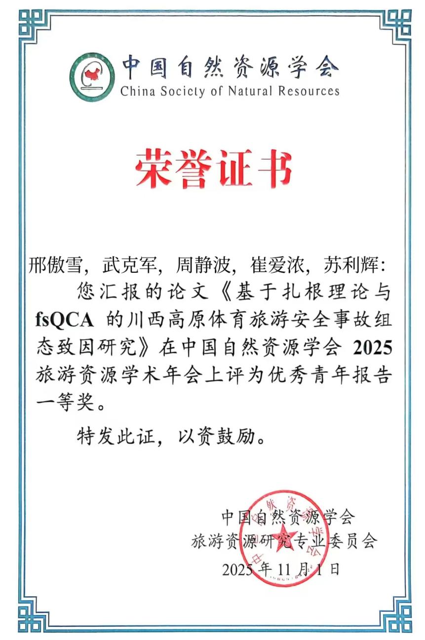 近日,我院武克军副教授指导学硕研究生邢傲雪、周静波、崔爱浓和苏利辉共同完成的研究成果《基于扎根理论与fsQCA的川西高原体育旅游安全事故组态致因研究》荣获“中国自然资源学会2025旅游资源学术年会”优秀青年报告一等奖。这项成果是我院在旅游安全与风险管理研究领域,深度融合质性研究与量化分析方法的成果之一,彰显了我院在运用混合研究方法攻坚旅游安全研究前沿课题方面的探索活力、扎实功底与日益提升的学术影响力。