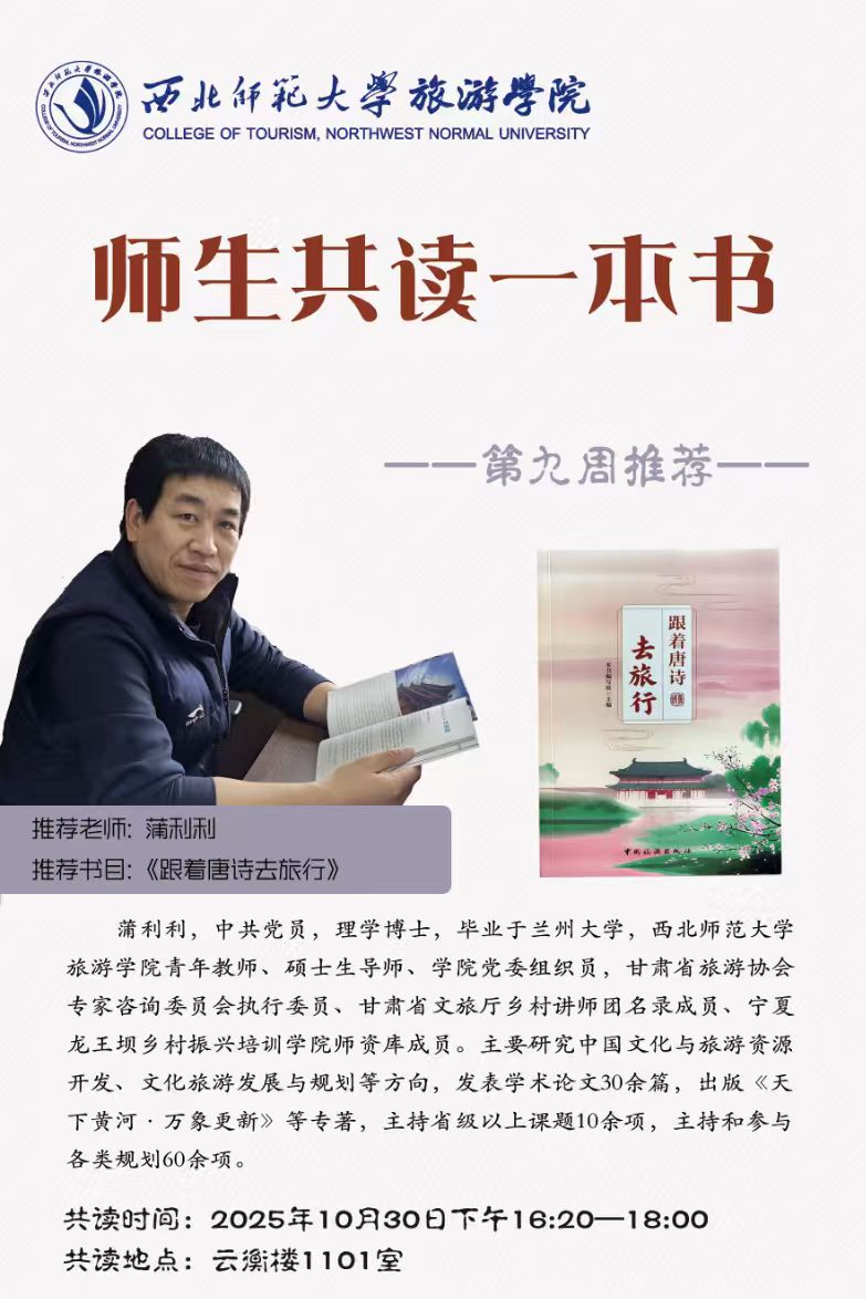 10月30日下午,第三期师生共读活动在云衢楼 1101 室如期开展。蒲利利老师为同学们推荐了《跟着唐诗去旅行》一书。活动中,蒲利利老师结合自身丰富的课题研究与规划实践经验,带领同学们循着唐诗足迹感受山河之美。同学们积极分享阅读心得,探讨唐诗中的文化内涵与旅游资源开发路径,在交流中深化了对文旅融合的理解。